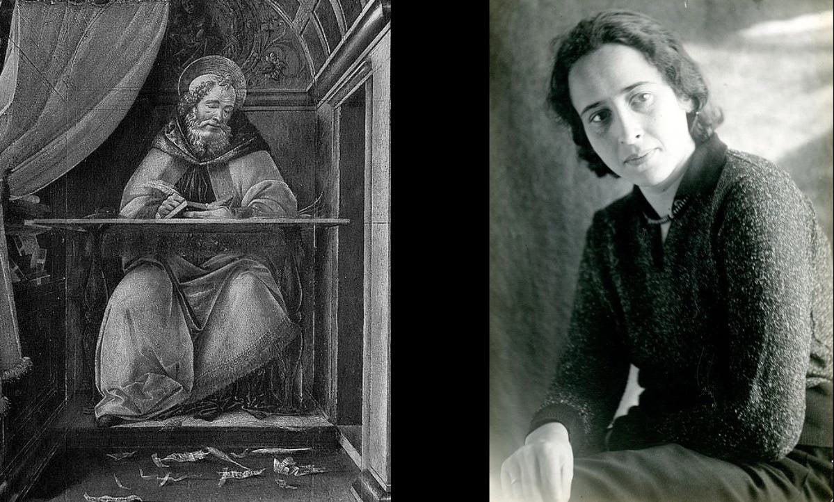 As a young woman, Arendt began her scholarly career with an exploration of the concept of caritas and its potential to create social change as described by St. Augustine in the Confessions and City of God. This developed into a life long affinity for many of his central ideas and influenced her later examination of Nazism, especially her characterization of those who succumb to evil.